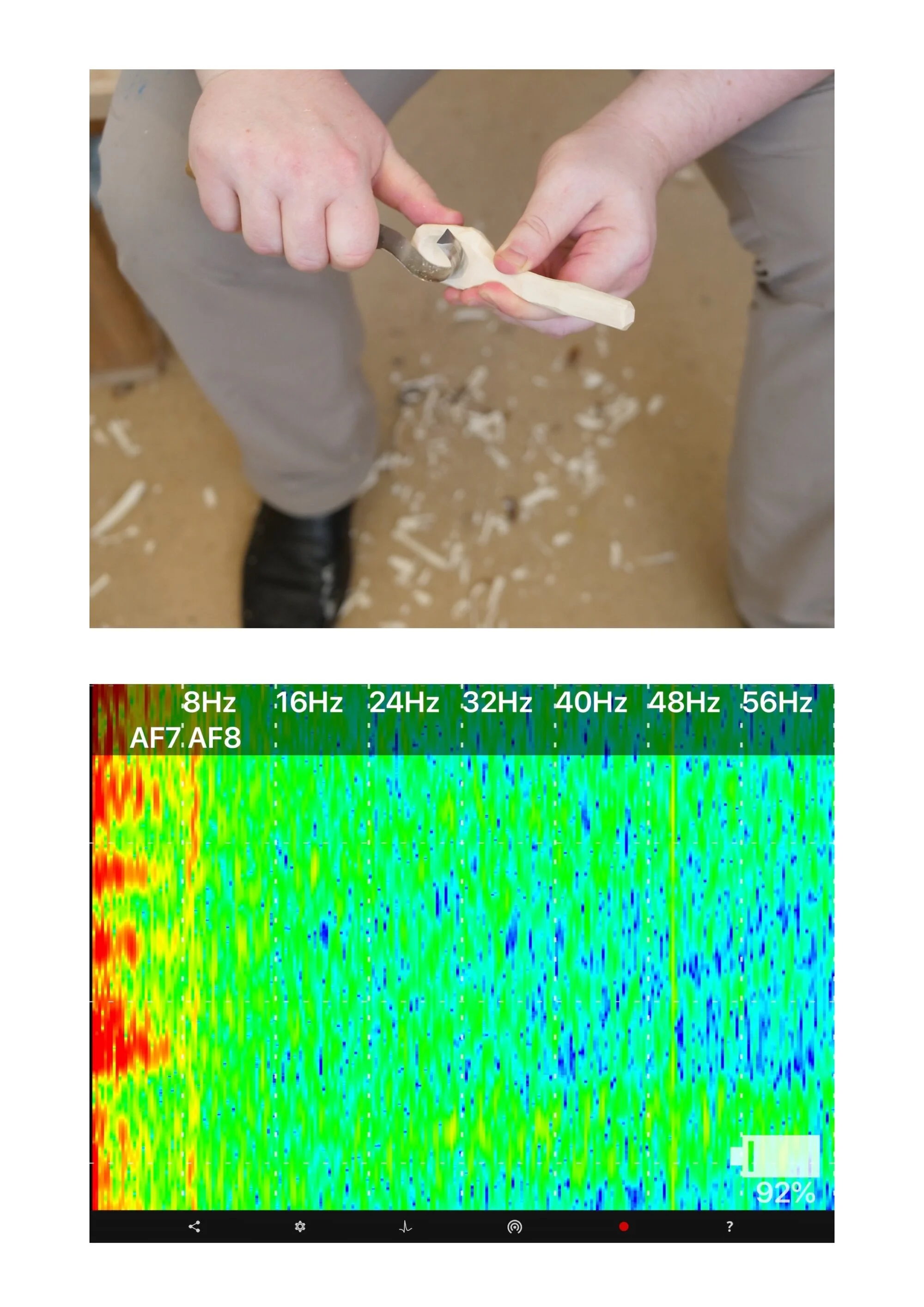 As you can see, this looks remarkably close to nothing, and not at all like reading a book. As the work progresses, my concentration increases until the brainwave display starts to look more and more like the focused state of reading a book. As we will see later, simply holding a finished spoon in my hand also looks almost completely like the baseline wandering mind, while using the spoon for its intended purpose creates a brainwave image closer to that of concentration.